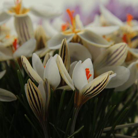 Superbecrocus multiple à pétales blancs rayés de violet à l’extérieur.